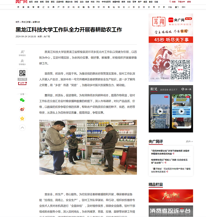 28/ 2024-04央广网:乐鱼网站_乐鱼(中国)工作队全力开展春耕助农工作近日,央广网以《乐鱼网站_乐鱼(中国)工作队全力开展春耕助农工作》为题报道乐鱼网站_乐鱼(中国)驻村工作队工作开展情况。现全文转发。乐鱼网站_乐鱼(中国)工作队全力开展春耕助农工作乐鱼网站_乐鱼(中国)驻黑龙江省绥棱县泥尔河乡抚北村工作队以党建为引领,以百姓为中心,立足村情实际,为农民办实事、做好事、解难事,积极组织开展春耕备耕工作。重政策、抓宣传,问需于民。为推动党的惠农好政策落实落地,驻村工作队深入开展入户走访,宣讲中央一号文件精...