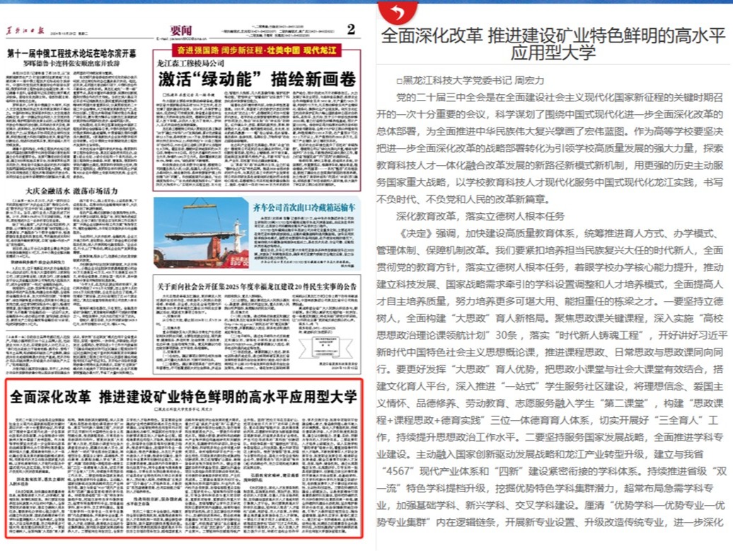 30/ 2024-10黑龙江日报:全面深化改革 推进建设矿业特色鲜明的高水平应用型大学编者按:10月29日,《黑龙江日报》2版刊发了乐鱼网站_乐鱼(中国)党委书记周宏力的署名文章《全面深化改革 推进建设矿业特色鲜明的高水平应用型大学》。现将全文转发,以便学习交流。全面深化改革 推进建设矿业特色鲜明的高水平应用型大学□乐鱼网站_乐鱼(中国)党委书记 周宏力党的二十届三中全会是在全面建设社会主义现代化国家新征程的关键时期召开的一次十分重要的会议,科学谋划了围绕中国式现代化进一步全面深化改革的总体部署,为全面推进中华...