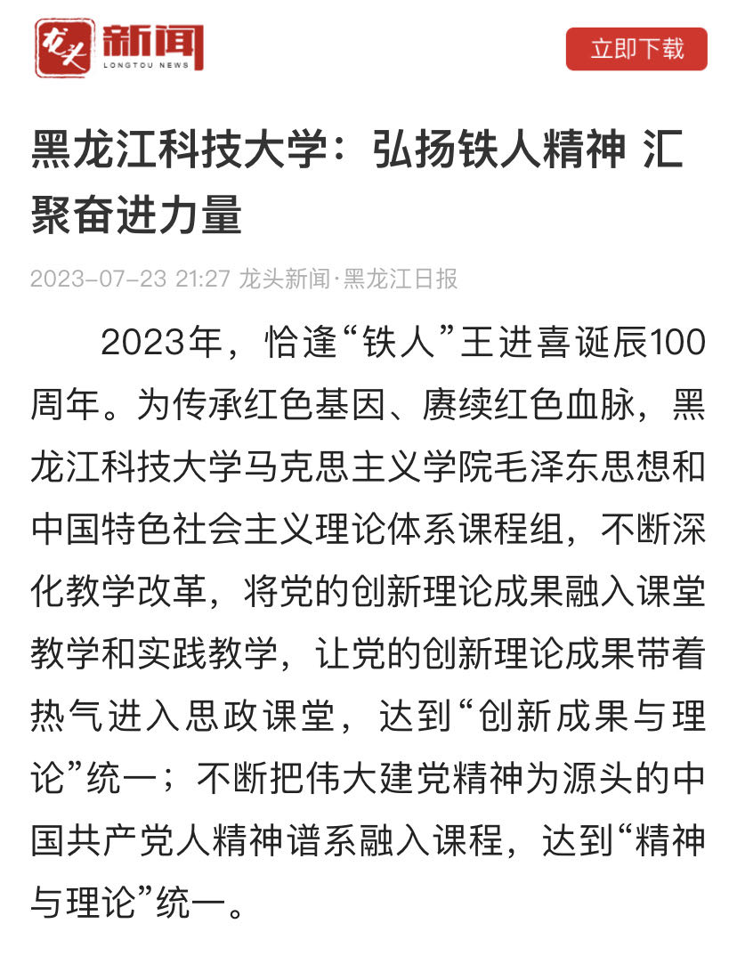 24/ 2023-07龙头新闻报道乐鱼网站_乐鱼(中国)思想政治理论课教学实践情况7月23日,龙头新闻以《乐鱼网站_乐鱼(中国):弘扬铁人精神 汇聚奋进力量》为题对乐鱼网站_乐鱼(中国)马克思主义学院毛泽东思想和中国特色社会主义理论体系课程组,以“追忆铁人的奋斗人生,缅怀铁人的丰功伟绩,感悟铁人的崇高精神,强化使命担当接续奋斗”为主题,围绕铁人精神开展系列课堂内外、学校内外、网络上下的教学实践情况进行了报道。现将全文转发,以便学习交流。乐鱼网站_乐鱼(中国):弘扬铁人精神 汇聚奋进力量2023年,恰逢“铁人”王进喜诞...