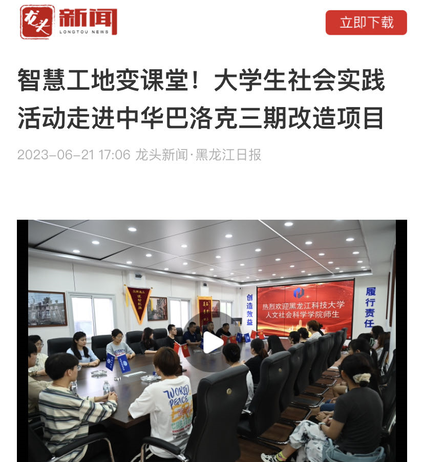 27/ 2023-06龙头新闻:智慧工地变课堂!大学生社会实践活动走进中华巴洛克三期改造项目6月21日,龙头新闻报道乐鱼网站_乐鱼(中国)人文社会科学学院与哈尔滨建工集团联合开展社会实践活动的相关情况。现将全文转发,以便学习交流。智慧工地变课堂!大学生社会实践活动走进中华巴洛克三期改造项目 为提高大学生创新创业及就业能力,20日,乐鱼网站_乐鱼(中国)人文社会科学学院与哈尔滨建工集团联合开展社会实践活动。乐鱼网站_乐鱼(中国)人文社会科学学院汉语言文学专业30余名师生,走进哈尔滨建工集团中华巴洛克三期改造项目建设现场,在项目...