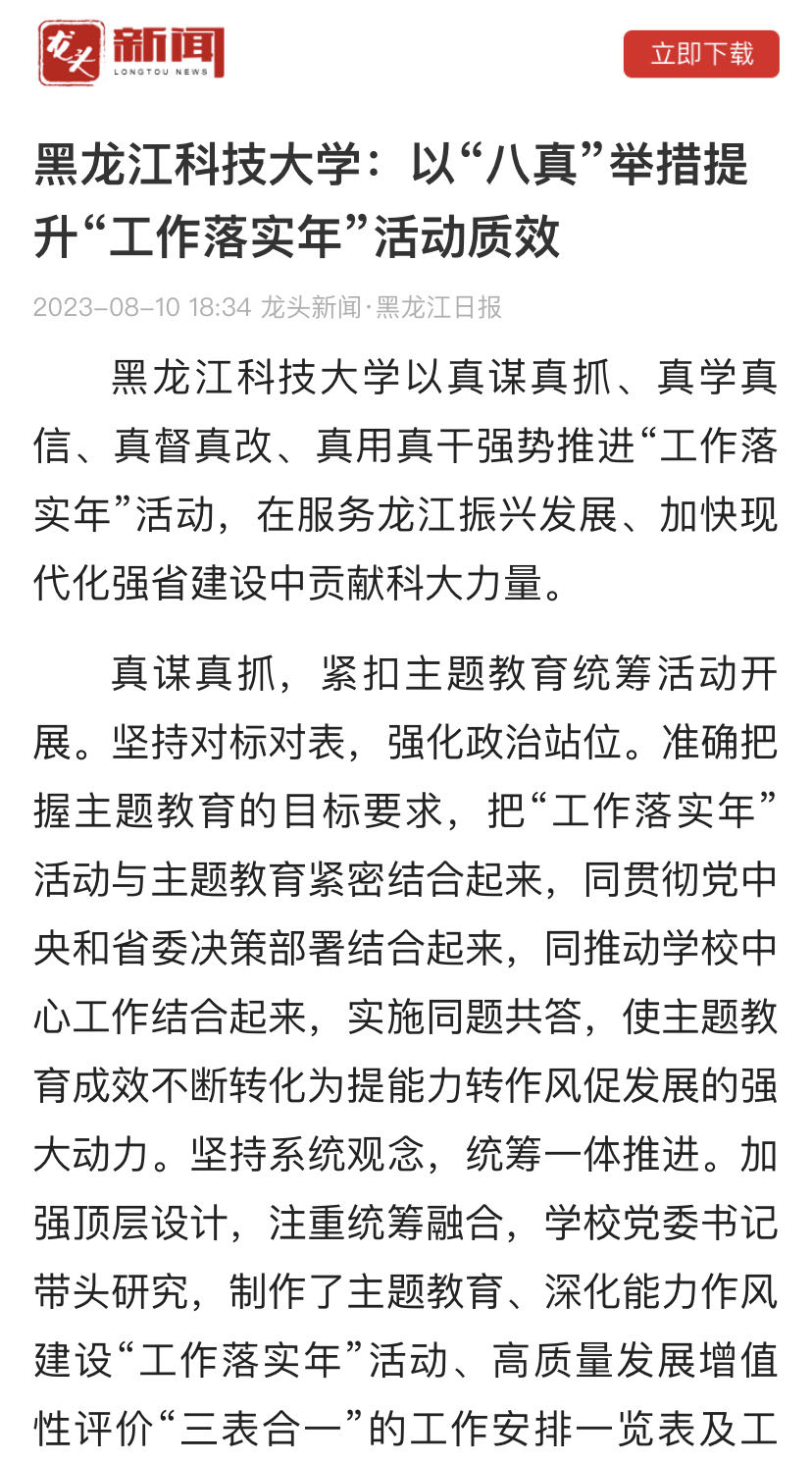 11/ 2023-08龙头新闻报道乐鱼网站_乐鱼(中国)“工作落实年”活动开展情况8月10日。龙头新闻以《乐鱼网站_乐鱼(中国)以“八真”举措提升“工作落实年”活动质效》为题报道乐鱼网站_乐鱼(中国)“工作落实年”活动开展情况。现将全文转发,以便学习交流。乐鱼网站_乐鱼(中国)以真谋真抓、真学真信、真督真改、真用真干强势推进“工作落实年”活动,在服务龙江振兴发展、加快现代化强省建设中贡献乐鱼网站_乐鱼(中国)力量。真谋真抓,紧扣主题教育统筹活动开展。坚持对标对表,强化政治站位。准确把握主题教育的目标要求,把“工作落实年”活动与主...