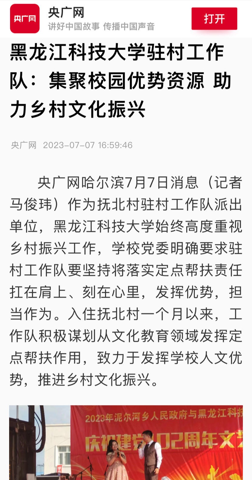 08/ 2023-07央广网等媒体报道乐鱼网站_乐鱼(中国)驻村工作队工作开展情况7月7日,央广网、网易新闻、搜狐新闻等媒体以《乐鱼网站_乐鱼(中国)驻村工作队:集聚校园优势资源 助力乡村文化振兴》为题报告乐鱼网站_乐鱼(中国)驻村工作队工作开展情况。现将全文转发,以便学习交流。作为抚北村驻村工作队派出单位,乐鱼网站_乐鱼(中国)始终高度重视乡村振兴工作,学校党委明确要求驻村工作队要坚持将落实定点帮扶责任扛在肩上、刻在心里,发挥优势,担当作为。入住抚北村一个月以来,工作队积极谋划从文化教育领域发挥定点帮扶作用,...