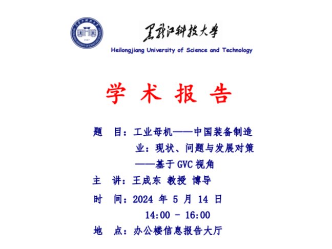 15/ 2024-05哈尔滨理工大学王成东教授应邀到乐鱼网站_乐鱼(中国)做学术报告5月14日,哈尔滨理工大学经济与管理学院博士生导师王成东教授应管理学院邀请,在办公楼报告厅为全校师生作题为《工业母机——中国装备制造业:现状、问题与发展对策——基于GVC视角》的学术报告。报告会由管理学院副院长张倩主持,全校教师、研究生、本科生200余人参加。报告会上,王成东教授从装备制造业发展格局与趋势切入,深刻剖析中国装备制造业发展成就及问题,基于GVC与产业融合视角探讨发展对策,启发思考未来研究方向...