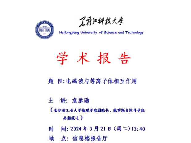 22/ 2024-05哈尔滨工业大学物理学院副院长袁承勋教授应邀来乐鱼网站_乐鱼(中国)做学术报告5月21日,哈尔滨工业大学物理学院副院长、俄罗斯自然科学院外籍院士、黑龙江省物理学会副理事长兼秘书长袁承勋教授应邀在信息楼报告厅,为全校师生作题为《电磁波与等离子体相互作用》的学术报告。报告会由科技处副处长王涛主持,理学院领导、教师及全校相关专业教师、研究生及本科生共200多人参加了本次学术报告会。报告会上,袁承勋教授与师生亲切互动交流学术问题,从学科介绍到研究背景,再到电磁波在等离子体中传输的基本...