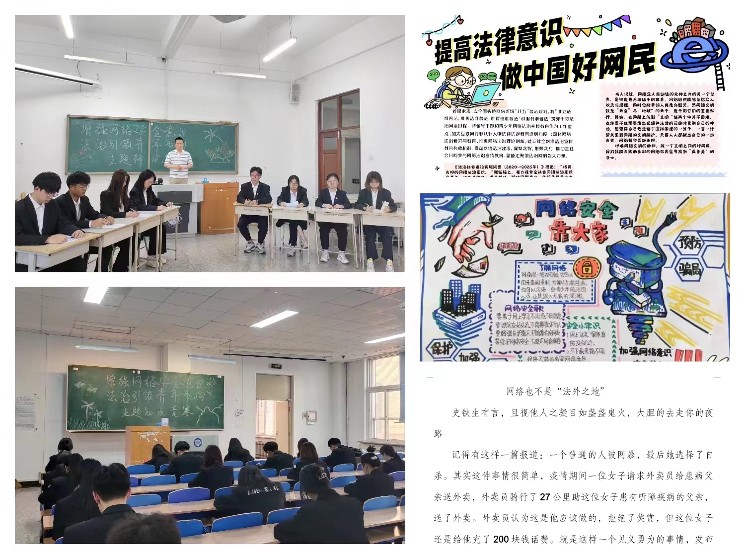19/ 2023-05矿业工程学院开展“提升网络法治意识和素养”专题思想教育系列活动根据《关于在全校学生中开展“提升网络法治意识和素养”专题思想教育活动的实施方案》的相关要求,为推动网络法治教育工作深入开展,形成良好网络行为规范,扩大教育覆盖面和受益面,切实增强广大学子的网络安全意识,矿业工程学院举办系列专题教育活动。全面开展主题班会,增强网络法治意识。各班以念诵领学和小组讨论的方式,向同学们宣讲网络安全法律知识、科普网络防骗招数、剖析网络案例,让同学们清楚地认识到网络上存在...