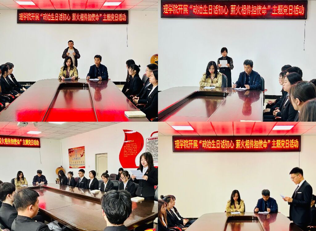 22/ 2023-05理学院开展“政治生日话初心 薪火相传担使命”主题党日活动5月22日,理学院开展“政治生日话初心,薪火相传担使命”主题党日活动,学生第二党支部书记刘雪霏主持,教师、学生党员代表参加了活动。活动现场,30多名党员重温入党誓词,齐唱《没有共产党就没有新中国》。随后,闫龙海同志宣读了2023年第2季度过“政治生日”的11名党员名单。支部书记为他们发送了祝福短信、赠送了“政治生日”贺卡和“红色”书籍,饱含了温暖的祝福和殷切的希望。孙立红、于丽艳、林欣宇、刘洋4名党员代表许...