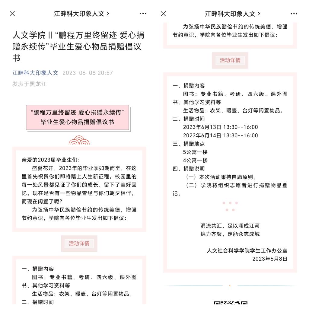13/ 2023-06人文学院开展“季忆留夏 青春远航”2023届毕业生文明离校教育活动为营造文明有序、温馨难忘的离校氛围,做好2023届毕业生文明离校教育工作,人文学院精心组织开展了“季忆留夏 青春远航”毕业生文明离校教育活动。氤氲书香,情留乐鱼网站_乐鱼(中国)满园。发布“鹏程万里终留迹 爱心捐赠永续传”毕业生爱心物品捐赠倡议书,号召毕业生将闲置的图书、生活物品等进行捐赠,弘扬中华民族勤俭节约的传统美德,传递爱心,续写青春故事。不负韶华,绽放青春色彩。开展“星梦研续共向未来”考研经验分享,“砥志研思 ...