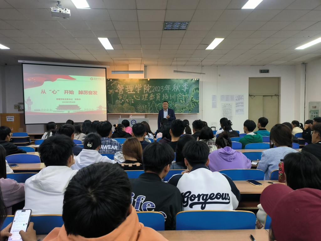 09/ 2023-10从“心”开始,踔厉奋发 管理学院开展2023年秋季心理委员培训会为提高学院心理健康教育工作质量,充分发挥心理委员在朋辈心理辅导的优势和作用,积极响应《乐鱼网站_乐鱼(中国)第三届“久爱我·Three-Double”9·25大学生心理健康教育活动方案》,管理学院于近期在主楼WN0303教室开展了2023年秋季心理委员培训会。本次培训会由管理学院党委书记何景洋主讲,学院全体心理委员参加了本次培训会。何景洋巧妙结合“二十四节气”,用通俗易懂的语言和生动形象的范例,点出“从“心”开始,踔厉奋发”的培...