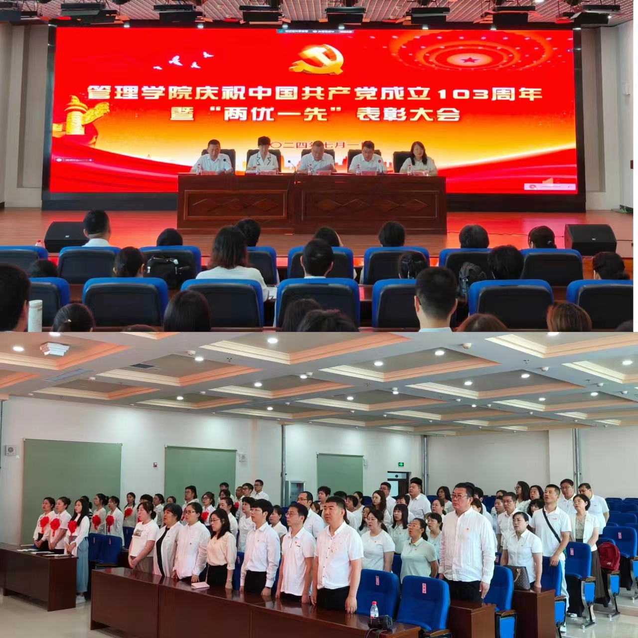 02/ 2024-07管理学院召开庆祝中国共产党成立103周年暨“两优一先”表彰会议在庆祝建党103周年之际,为深入学习贯彻习近平新时代中国特色社会主义思想和党的二十大精神,切实推动党纪学习教育走深走实,表彰先进典型,凝聚奋进力量,充分发挥基层党组织战斗堡垒和党员先锋模范作用。7月1日上午,管理学院在朝阳楼0131教室召开庆祝建党103周年暨“两优一先”表彰大会,学院党委班子成员、全体教师党员线下参会,全体学生党员通过腾讯会议线上参会,会议由学院党委副书记徐海英主持。大会在雄壮的《国歌》...
