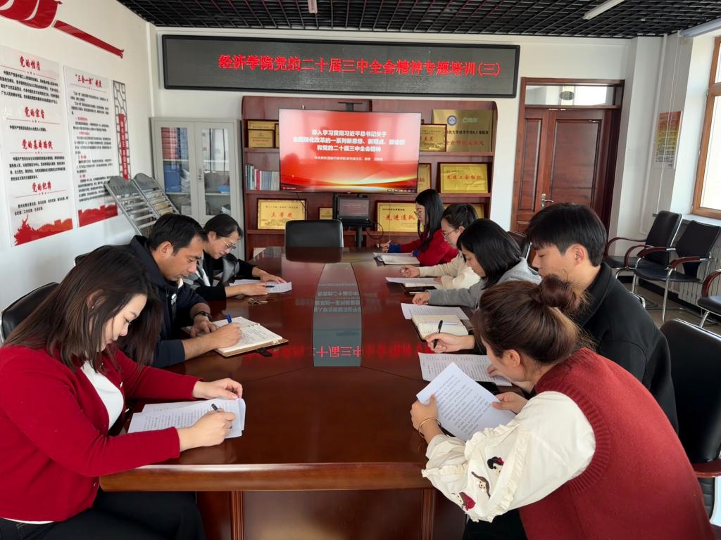 29/ 2024-11经济学院组织党员干部集中学习党的二十届三中全会精神为深入学习贯彻党的二十届三中全会精神,引导党员干部用党的二十届三中全会精神武装头脑、指导实践、推动工作,按照学校党委安排部署,学院于11月21-28日组织开展了党员干部贯彻落实党的二十届三中全会精神学习培训。本次培训以集中学习、个人自学及研讨交流的形式开展。11月28日,学院在朝阳楼0502召开“党的二十届三中全会精神专题培训结训式”。学院党委副书记邬丽群、部分党员干部参加了培训式,结训式由学院党委书记雷金屹主持。结训式上,与会人员集中观看“深入学习习近平总书记关于全面深化改革...