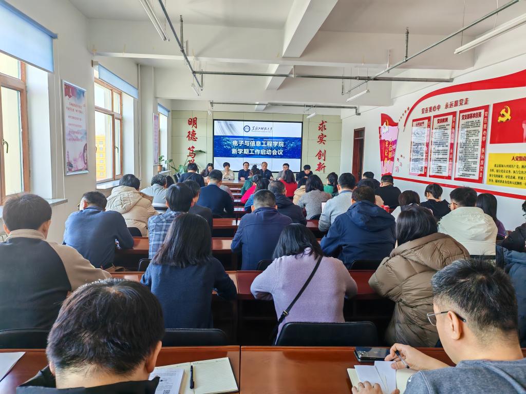27/ 2025-02电信学院召开新学期工作启动会议2月27日上午,电子与信息工程学院在朝阳楼0809会议室召开新学期工作启动会议,学院班子成员、全体教职工参加会议。会议由电子与信息工程学院正处级辅导员吕平主持。会上,学院党委书记齐秀强首先传达了学校党委二届八次全体会议精神。齐秀强强调,2025年是“十四五”规划收官之年、“十五五”规划谋划之年,是实现学校第二次党员代表大会目标任务的关键之年,是我们进一步深化综合改革、推动学校各项事业高质量发展的重要之年,...