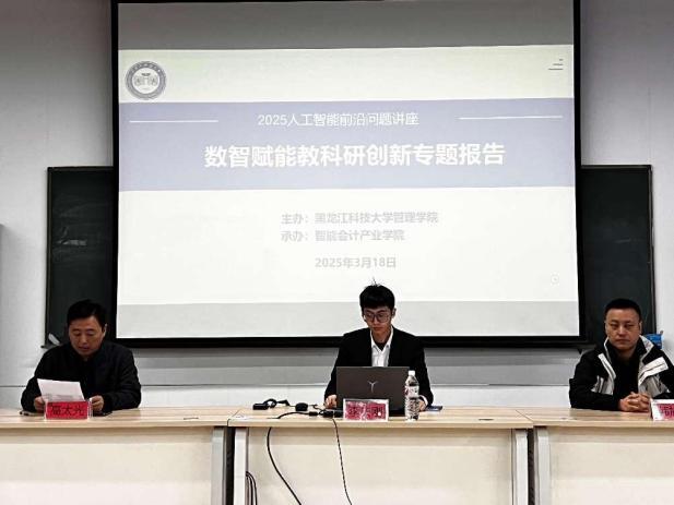 20/ 2025-03管理学院举办数智赋能教科研创新发展专题报告3月18日下午,管理学院依托智能会计产业学院开展“数智赋能教科研创新发展”专题报告,旨在提升全院教师利用人工智能技术与教育教学深度融合能力。活动由教学副院长高太光主持,学院领导班子、全体教师和部分研究生参加。活动邀请金蝶软件(中国)有限公司培训教育事业部东北区总监韩旭升、哈尔滨公司研发总监李庆刚、智慧树网产品经理谢议国三位企业专家,分别围绕“人工智能发展、应用与创新实践”“人工智能赋能高等教育教学新形态——AI教学中心应用”两个专题进行现场讲解和演示,为全体教师科学应对人工智能...