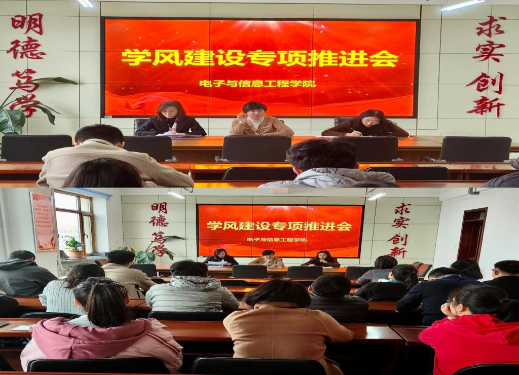 31/ 2025-03电子与信息工程学院召开学风建设专项推进会为充分发挥班主任在学风建设中的核心作用,切实解决当前学风中的突出问题,帮助学生顺利完成学业,提升人才培养质量。电子与信息工程学院于3月26日在朝阳楼0809召开学风建设专项推进会。学院全体班主任参加会议,会议由学院正处级辅导员吕平主持。会议围绕“强化学风管理,提升育人实效”主题,系统分析当前学风建设现状。会上陆冠楠对学院各年级、各班级的学风建设情况进行了全面梳理和数据通报,针对班级英语过级率、补考压科人数、学业预警人数等关键指标进行了逐项通报,指出当前学风建设存在的突出问题,并...