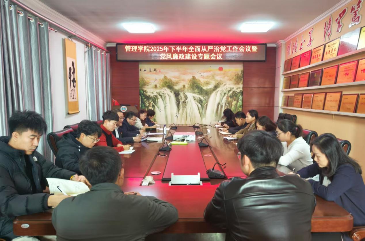 03/ 2025-11管理学院召开2025年下半年全面从严治党工作会议暨党风廉政建设专题会议10月31日上午,管理学院党委在学院三楼会议室召开2025年下半年全面从严治党工作会议暨党风廉政建设专题会议,学院党委班子成员、师生党支部书记、全体辅导员参加会议,会议由党委书记何景洋主持。会上,集中传达学习习近平总书记在党的二十届四中全会上的重要讲话和会议精神,对院系两级党组织认真组织学习《习近平谈治国理政》第五卷进行了安排部署,听取了学院纪委关于开展“一院一品”廉洁文化建设活动的总结汇报,并对学院下一步党风廉政建设和党支部换届工作进行了专题研究。会议强调,全院上下要深刻领会...