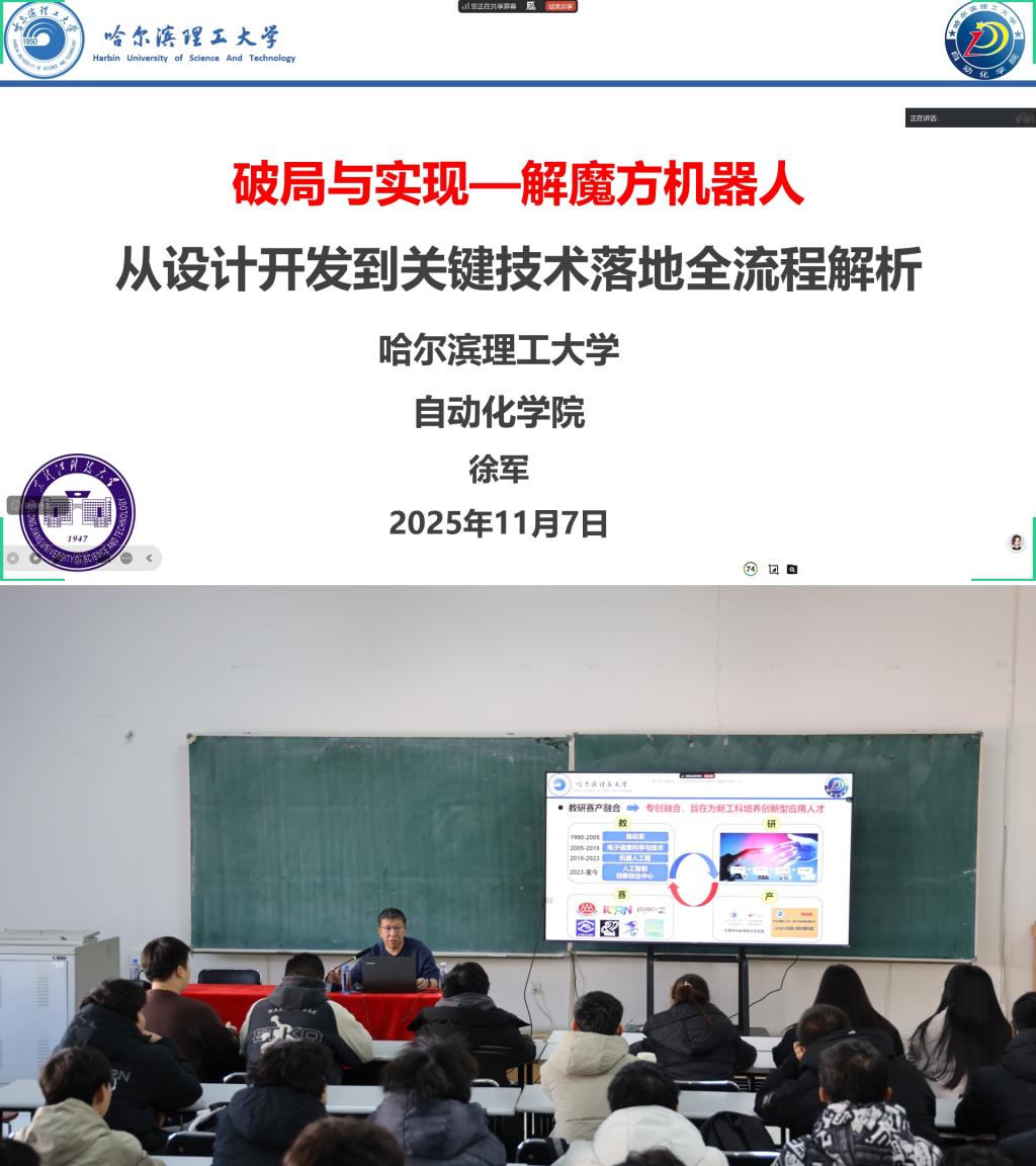 07/ 2025-11创新创业学院邀请哈尔滨理工大学徐军教授到校作学术报告为丰富校园学术文化氛围,深化人工智能与机器人领域学术交流,11月7日,哈尔滨理工大学徐军教授应邀到校作了题为《破局与实现—解魔方机器人从设计开发到关键技术落地全流程解析》的学术报告,相关院系200余名师生参加了报告会,报告会由创新创业学院副院长韩大伟主持。徐军教授长期深耕人工智能应用技术、机器人技术与传感技术领域,尤其在机器人技术落地应用方面有着深厚积累,是兼具理论深度与实践经验的行业专家。报告中,徐军教授从解魔方机器人的灵感来源出发,系统解析了硬件结构、软件平台、控制系统的核...