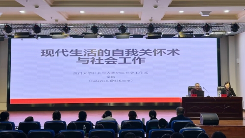 09/ 2025-12人文学院邀请厦门大学童敏教授到校作学术报告为深化社会工作专业学术交流,助力师生探索自我关怀与专业实践的融合路径,12月6日下午,学院邀请全国社会工作专业学位教育指导委员会委员、中国社会工作教育协会副理事长、厦门大学博士生导师童敏教授作了题为《现代生活中的自我关怀与社会工作》的学术报告,报告由人文学院院长曹景萍主持,共160余名教师和学生参加本次交流活动。童敏教授作学术报告报告中,童敏教授结合当代社会快节奏生活下的心理压力现状,系统阐释了自我关怀的核心内涵、科学方法及其在缓解焦虑、提升心理韧性中的重要作用。他从社会工作专...