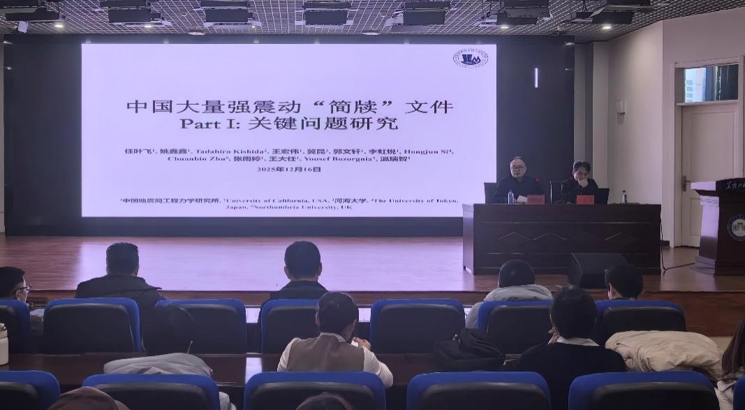 22/ 2025-12建筑工程学院邀请中国地震局工程力学研究所任叶飞研究员到校作学术报告12月16日下午,中国地震局工程力学研究所任叶飞研究员应建筑工程学院邀请,在朝阳楼0131会议室作了题为“中国大陆强震动‘简牍’文件研发及应用”的学术报告。报告由建筑工程学院副院长董连成主持,共160余名相关专业教师和学生参加本次交流活动。学术报告现场报告中,任叶飞研究员针对我国强震动观测领域长期存在的数据处理流程不统一、场地条件信息模糊等关键问题,系统阐述了中国大陆首个强震动“简牍”文件的研发历程与技术内核。该文件整合了事件、震源、台站等六类元数据,包含500余个核心参数,实...