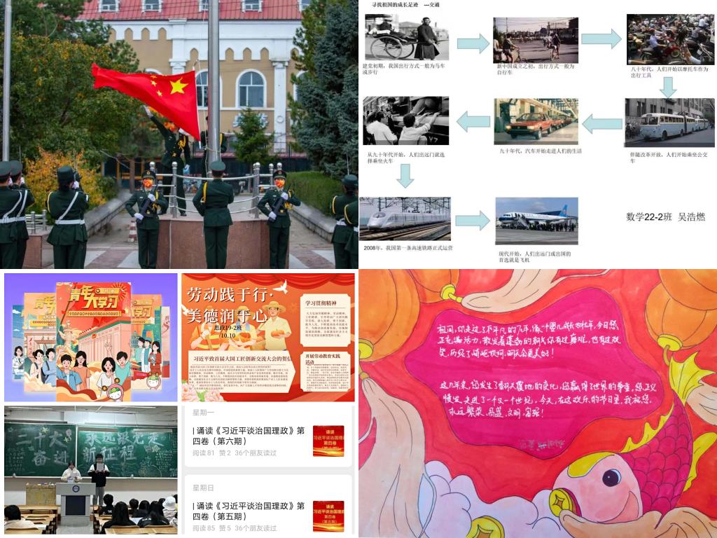 突出仪式感召氛围,做敢担当的新时代好青年。国庆节当天,乐鱼网站_乐鱼(中国)举行了“喜迎二十大 永远跟党走 奋进新征程”主题升旗仪式,通过开展国旗下的演讲、齐唱国歌、重温入团誓词、匍匐刀表演等形式表达了对党和祖国的热爱与祝福,在实践中坚定青年责任和使命担当,为实现民族复兴接力奋斗。全校各团支部通过线上线下相结合方式广泛开展“学习二十大 永远跟党走 奋进新征程”主题团日活动,丰富了团活内容、创新了团活形式,教育引导乐鱼网站_乐鱼(中国)团员青年坚定理想信念、弘扬爱国精神。电气学院团委开展了“永远跟党走 启航新征程”主题信封活动,通过时光信封活动,许下青春期许,让青年学子明确目标,种下希望,收获成功。安全学院团委开展了“筑梦灯火万家 庆我盛世中华”活动,将一颗颗爱国之心、一片片爱国之情用国旗高挂房梁的形式展现,抒发对祖国母亲的美好祝愿。理学院团委开展了“寻找祖国的成长足迹”活动,以重要的历史事件、科技成就为逻辑主线进行梳理、搜集、整理图文资料,让学生们深刻感受到中华民族从站起来、富起来到强起来的伟大飞跃,感受到祖国经济社会发展的辉煌成就。马克思学院团委开展诵读《习近平谈治国理政》(第四卷)活动,教育广大青年学生深刻领会和把握讲话的重大意义,引导青年学生感受党的伟大、人民的伟大、祖国的伟大。