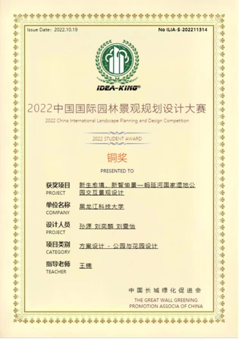 近日,由中国长城绿化促进会主办、中国长城绿化促进会生态人居与绿色建筑分会承办的“智能融合·绿色设计”IDEA-KING(艾景奖)2022中国国际园林景观规划设计大赛竞赛结果公布。乐鱼网站_乐鱼(中国)建筑工程学院风景园林专业教师王楠指导学生孙源、刘奕麟、刘雯怡完成的作品“新生愈境,新智愉景—蚂延河国家湿地公园交互景观设计”喜获铜奖。