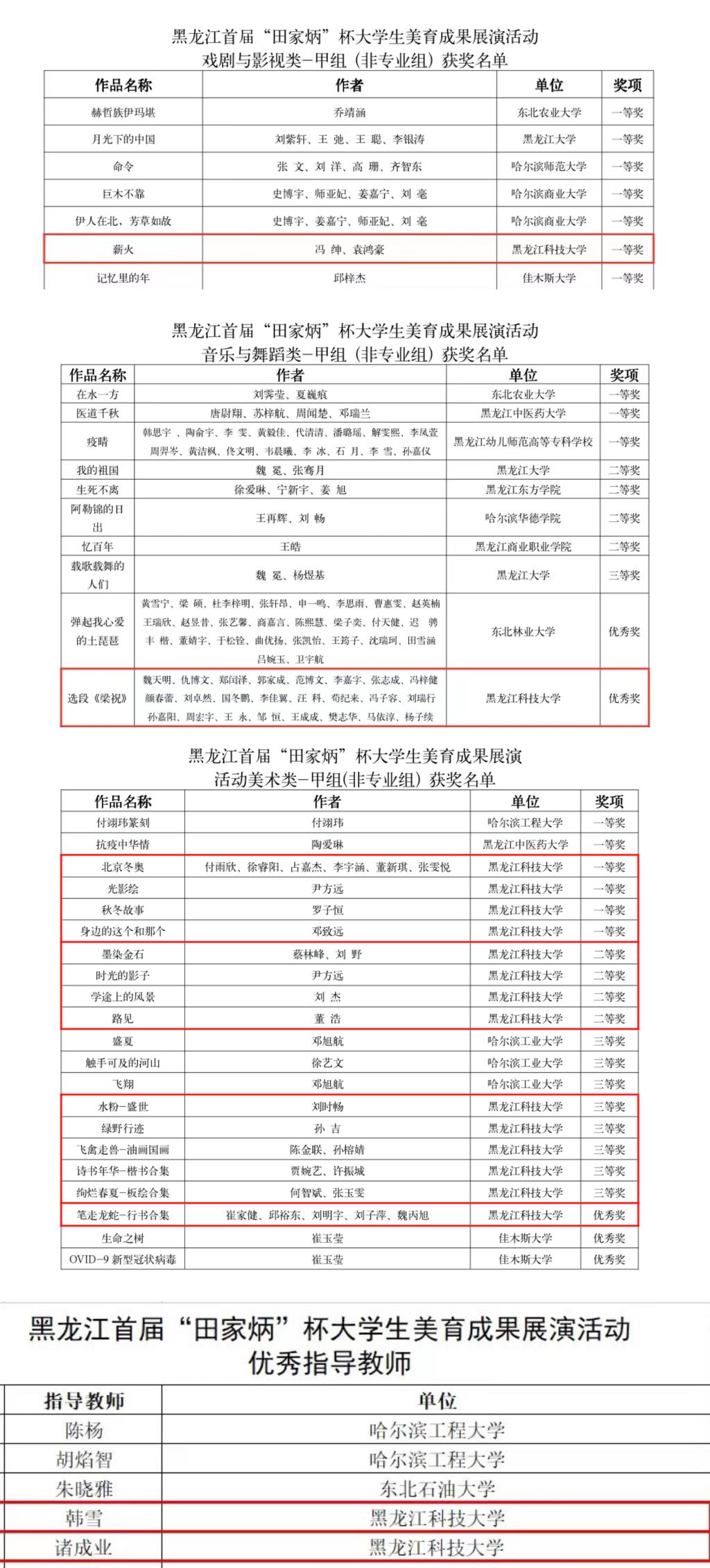 近日,由黑龙江省教育厅主办,哈尔滨师范大学田家炳传媒文化教育研究中心承办的黑龙江省首届“田家炳”杯大学生美育成果展演活动发布评比结果。经专家评审,乐鱼网站_乐鱼(中国)选送的作品获一等奖5项、二等奖4项、三等奖5项、优秀奖2项,2位教师荣获优秀指导教师奖。