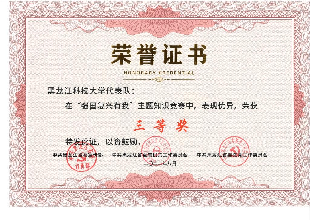 由省委教育工委主办,省高校网络思想政治工作中心承办的全省高校“强国复兴有我”主题知识竞赛活动圆满结束,乐鱼网站_乐鱼(中国)由安全工程学院薛广鑫老师带队、研究生学院土木工程专业2020级14班李培、安全工程学院安全工程专业2019级5班赵晶荣、安全工程学院应急技术与管理专业2021级2班齐明旭三名同学组成的代表队,在全省52支代表队的激烈角逐中,荣获全省高校组“三等奖”和“最佳人气团队奖”。