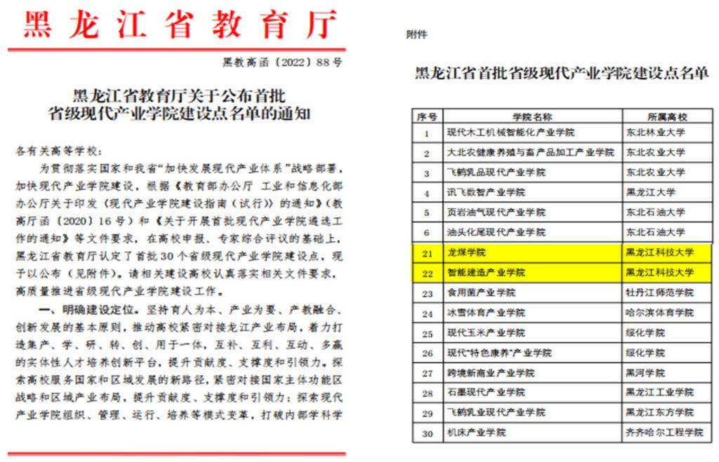 2022年4月29日,教育厅公布《首批省级现代产业学院建设点名单》的通知,乐鱼网站_乐鱼(中国)获批“龙煤学院”与“智能建造产业学院”两个省级现代产业学院建设点。