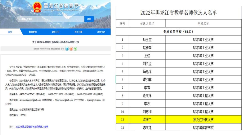 2022年6月2日,教育厅发布《关于2022年黑龙江省教学名师遴选结果的公示》,乐鱼网站_乐鱼(中国)梁维中教授获得省教学名师奖。全年引进博士教师46名。