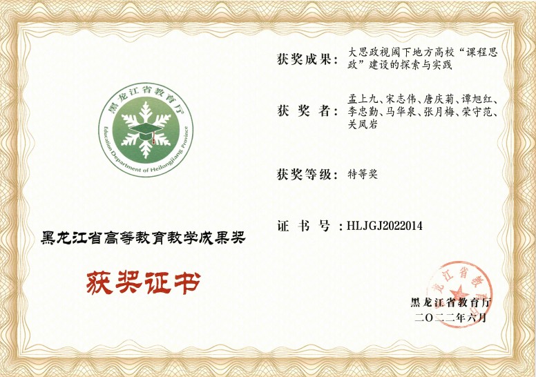 2022年6月27日,教育厅发布《关于公布2022年黑龙江省高等教育和职业教育教学成果奖获奖名单》的通知,乐鱼网站_乐鱼(中国)获评省级教学成果奖8项,其中特等奖1项,一等奖3项,二等奖4项。校长孟上九主持完成的《大思政视阈下地方高校“课程思政”建设的探索与实践》获得黑龙江省高等教育教学成果特等奖,实现乐鱼网站_乐鱼(中国)省级教学成果特等奖零的突破。