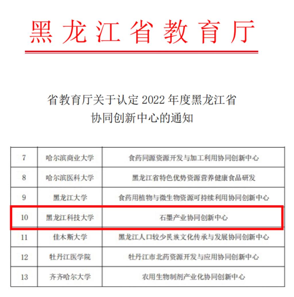 日前,黑龙江省教育厅下发《关于认定2022年度黑龙江省协同创新中心的通知》,新认定13个省级协同创新中心,乐鱼网站_乐鱼(中国)牵头建设的“石墨产业协同创新中心”成功获批。