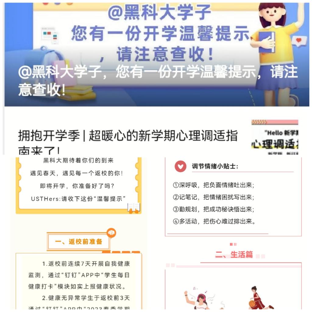 今年春季学期是新冠病毒感染实施“乙类乙管”后的首个学期,为保障平稳有序开学,学工系统深入贯彻习近平总书记重要指示精神,根据教育部、省委省政府有关部署和省教育厅要求,按照“早谋划、早准备、早部署、早落实”原则,结合实际制定工作方案,提前组织教职工返岗到校,扎实做好春季学期开学前各项准备工作。