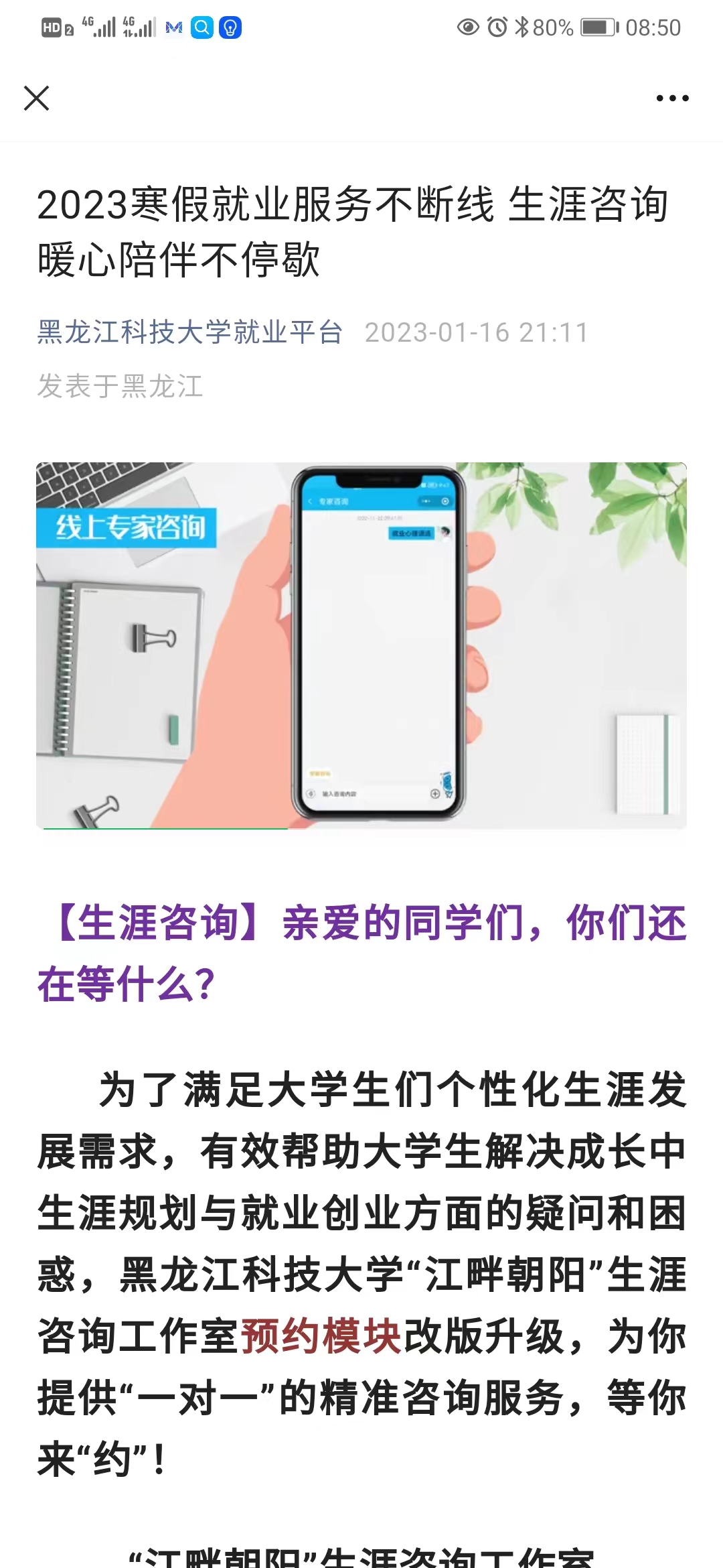 强化指导,暖心服务。为了满足大学生们个性化生涯发展需求,有效帮助大学生解决成长中生涯规划与就业创业方面的疑问和困惑,乐鱼网站_乐鱼(中国)“江畔朝阳”生涯咨询工作室依托“云就业平台”进行了线上咨询的全面升级改造,在“乐鱼网站_乐鱼(中国)就业平台”公众号上安排专业教师在寒假期间开展线上咨询,为学生提供“一对一”的生涯规划与就业指导个体咨询服务,在生涯咨询、简历修改、面试技巧、政策咨询、手续流程咨询、就业心理疏导、职业生涯测评等方面帮助学生探求答案,指引方向。