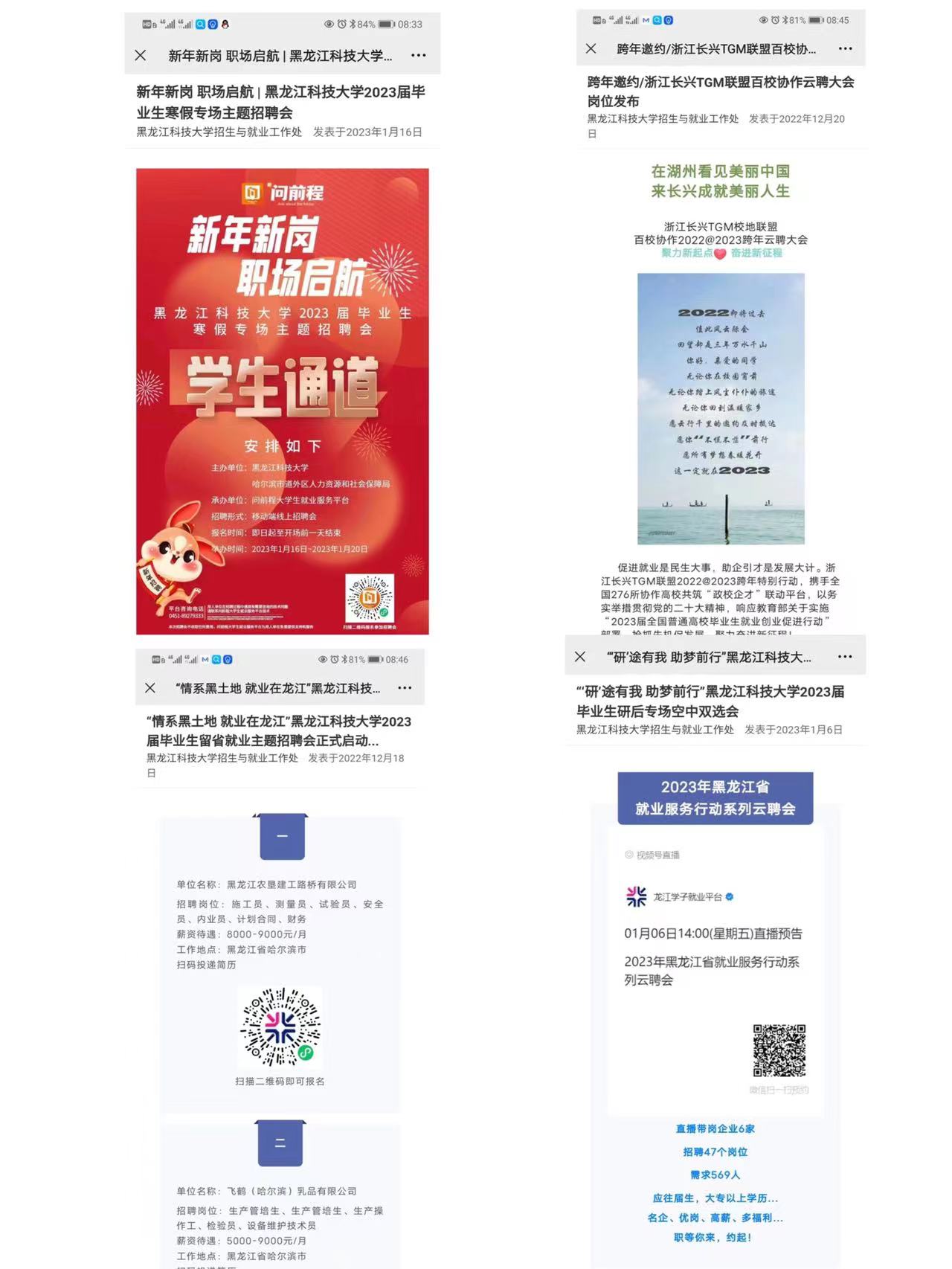 空中双选,持续供岗。学校积极对接地方人社部门,开展了浙江长兴“万岗纳才”云聘会和湖州市招引“云端”直通车线上双选会。学校联合龙江学子就业平台举办了线上综合招聘会和“‘研’途有我 助梦前行”研后专场空中双选会;联合问前程就业平台举办了“新年新岗职场启航”寒假专场主题招聘会;联合毕业申就业平台,举办综合类等线上双选会等,累计开展留省就业专场、春节专场、高校联合专场、地域类等各类线上双选会9场。参会企业852家,提供就业岗位15764个。