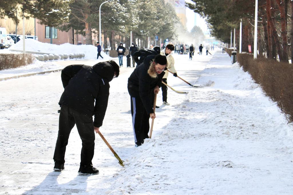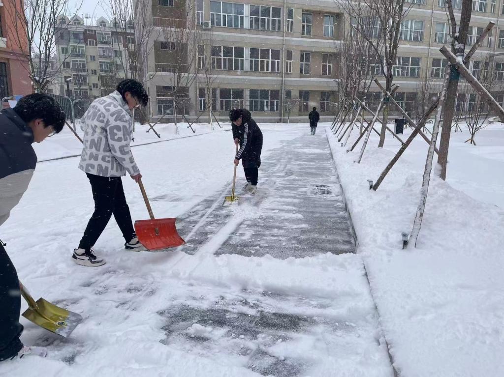 初春下了一场大雪,同学们挥舞着铁锹和扫帚,你铲我扫,迅速把道路上的积雪清扫干净,忙碌的身影构成了一道亮丽的校园风景线。