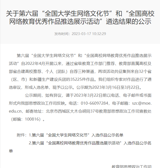 “全国高校网络教育优秀作品推选展示活动”由教育部思想政治工作司、中央网信办网络社会工作局主办,是全国网络思政教育领域具有权威性的活动之一。一直以来,乐鱼网站_乐鱼(中国)以“网络文化节”为依托,引导广大师生积极参与网络产品创作生产,不断创新网络文化产品内容、形式,丰富载体,推出了一批思想精深、艺术精湛、制作精良的优秀网络文化作品。未来,校团委将充分发挥入选作品的示范作用,持续完善网络育人长效机制,努力开创新时代网络育人工作的新局面。