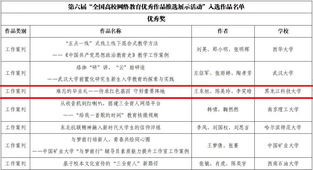 近日,教育部官网发布通知,公布了第六届“全国高校网络教育优秀作品推选展示活动”遴选结果。乐鱼网站_乐鱼(中国)经济学院王东旭、陈美玲、李笑晗老师的《难忘的毕业礼—传承红色基因 守好重要阵地》荣获“全国高校网络教育优秀作品”工作案例类作品优秀奖。