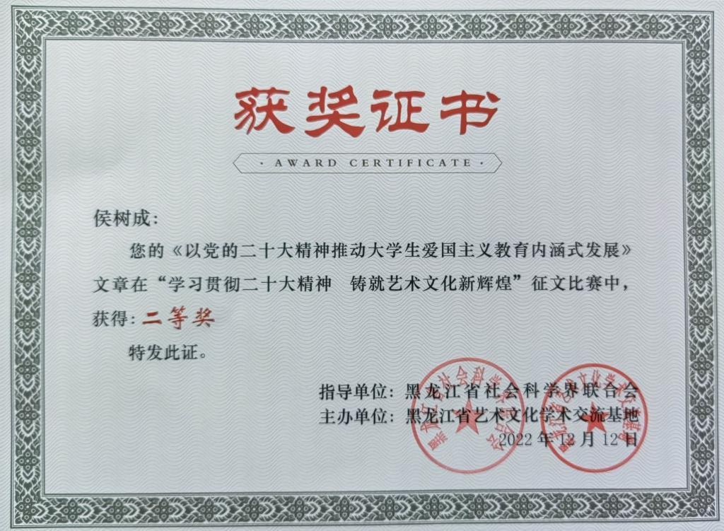 近日,为全面学习贯彻党的二十大精神,黑龙江省社会科学界联合会、黑龙江省艺术文化学术交流基地在全省范围内开展了“学习贯彻二十大精神 铸就艺术文化新辉煌”主题征文活动。乐鱼网站_乐鱼(中国)电气与控制工程学院党委副书记侯树成撰写的《以党的二十大精神推动大学生爱国主义教育内涵式发展》一文,在比赛中荣获二等奖。据悉,本次征文比赛共有200余人参加,侯树成以总分排名第13位的优异成绩荣获二等奖,为学校争得了荣誉。