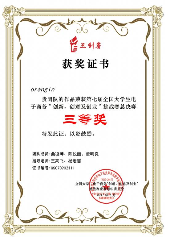 本次比赛在全国设立32个省级赛区,共有1268所高校的19830支队伍参赛。在学校教务处和管理学院高度重视并大力支持下,管理学院“创新创业工作室”组建了“ORANGIN”团队,并推出了包含“互联网+”创意元素的“‘你的眼’可视化营销平台”产品。在信管专业王高飞、杨宏慧老师的指导下,荣获黑龙江省赛区“一等奖”并获得参加决赛资格。参赛项目在总决赛中赢得评委的好评,并喜获“全国总决赛三等奖”。