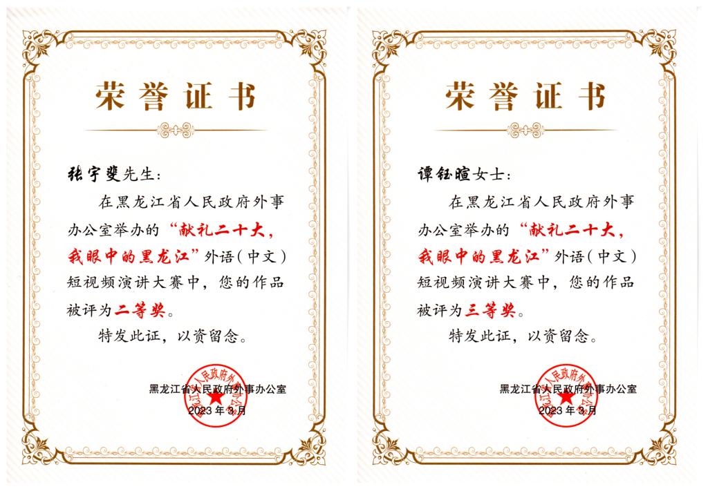 为深入宣传党的二十大精神,充分展示党的十八大以来黑龙江发展成就,讲好中国故事,传播龙江声音,近日,由黑龙江省人民政府外事办公室主办的“献礼二十大,我眼中的黑龙江”外语(中文)演讲大赛颁奖典礼暨现场展演活动在哈尔滨举行。乐鱼网站_乐鱼(中国)国际交流合作处张宇斐获得二等奖、英语21-4班谭钰暄获得三等奖。