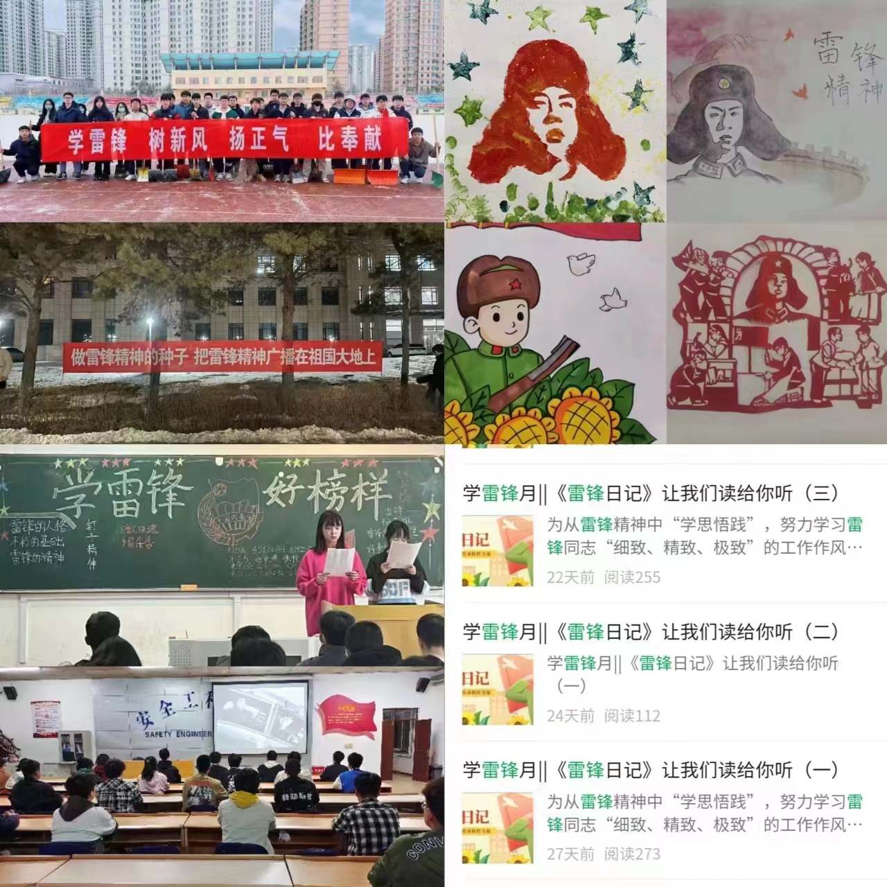 燃“信仰之火”,锤炼新本领,做新时代雷锋精神的传承者。志愿者行动月的号令一出,各级团学组织主动发声,共筑宣传主阵地。校团委通过高潮报和宣传条幅大力营造学习雷锋的浓郁氛围,官方微信公众号增设《雷锋日记》专栏、飞跃之声有线广播增设《雷锋精神说》通过媒介形式把雷锋精神的种子,播撒在乐鱼网站_乐鱼(中国)的大地上;第十四期青马班学员广泛响应号召,多次进行志愿清雪服务,用实际行动守护美丽校园;深入开展团日活动,组织动员全校团支部广泛开展“学习雷锋精神·树立诚信理念”主题团日活动1000余场次,覆盖全校700余个团支部,让青年学生在团日活动中接受理想信念熏陶,用实际行动诠释志愿服务的意义;安全学院团委组织青年学生代表观看电影《雷锋》,将雷锋精神、志愿精神烙印广大青年学子心中;电信学院团委组织学生开展“学雷锋”安全知识普及活动,用文字传递力量号召学生争做新时代雷锋精神的传承者;理学院团委组织开展“我心目中的雷锋”绘画比赛,通过绘制雷锋画像的方式,使同学们铭记雷锋形象,牢记雷锋精神。