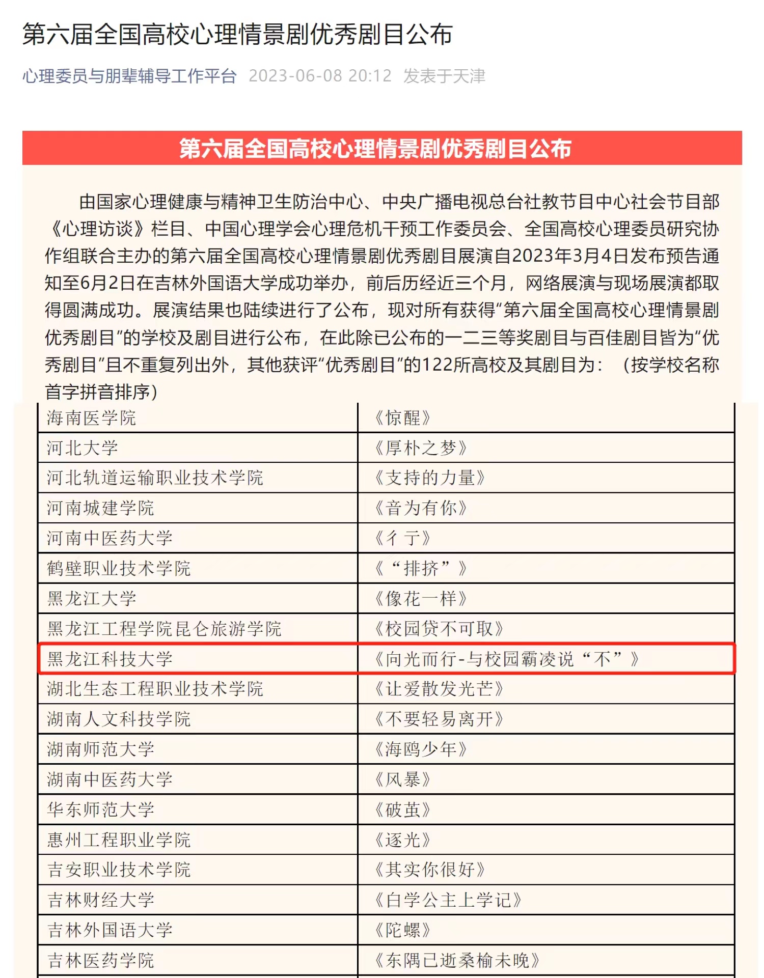 6月8日,由国家心理健康与精神卫生防治中心、中央广播电视总台社教节目中心社会节目部《心理访谈》栏目、中国心理学会心理危机干预工作委员会、全国高校心理委员研究协作组联合主办的第六届全国高校心理情景剧优秀剧目的展演活动圆满落幕,乐鱼网站_乐鱼(中国)原创剧目《向光而行-与校园霸凌说“不”》以出色的表现入选全国高校心理情景剧“优秀剧目”,这也是乐鱼网站_乐鱼(中国)心理情景剧首次获得此项全国赛事的荣誉。