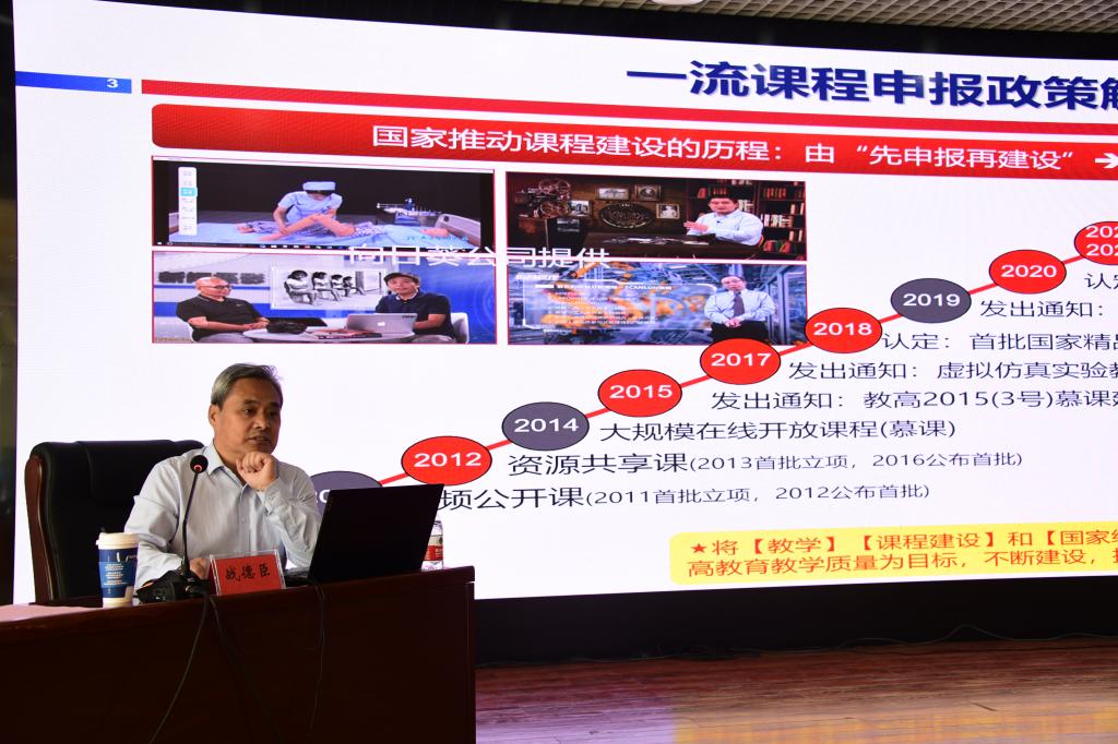 会上,战德臣教授结合自身课程建设与教学案例,围绕“一流课程申报政策解读”“如何准备线上一流课程申报材料”“如何准备线上线下混合式一流课程申报材料”等问题,深入浅出地对一流课程申报政策进行了剖析,详细介绍了线上课程、线上线下混合式课程建设标准,以及如何在一流课程建设中有效提升课程的高阶性、突出创新性、增加挑战度。培训内容丰富,案例讲解精彩,标准指导性强,令在座教师受益匪浅。培训会最后,战教授与参会教师代表进行了简短的交流,对教师的疑惑进行了解答和指导。