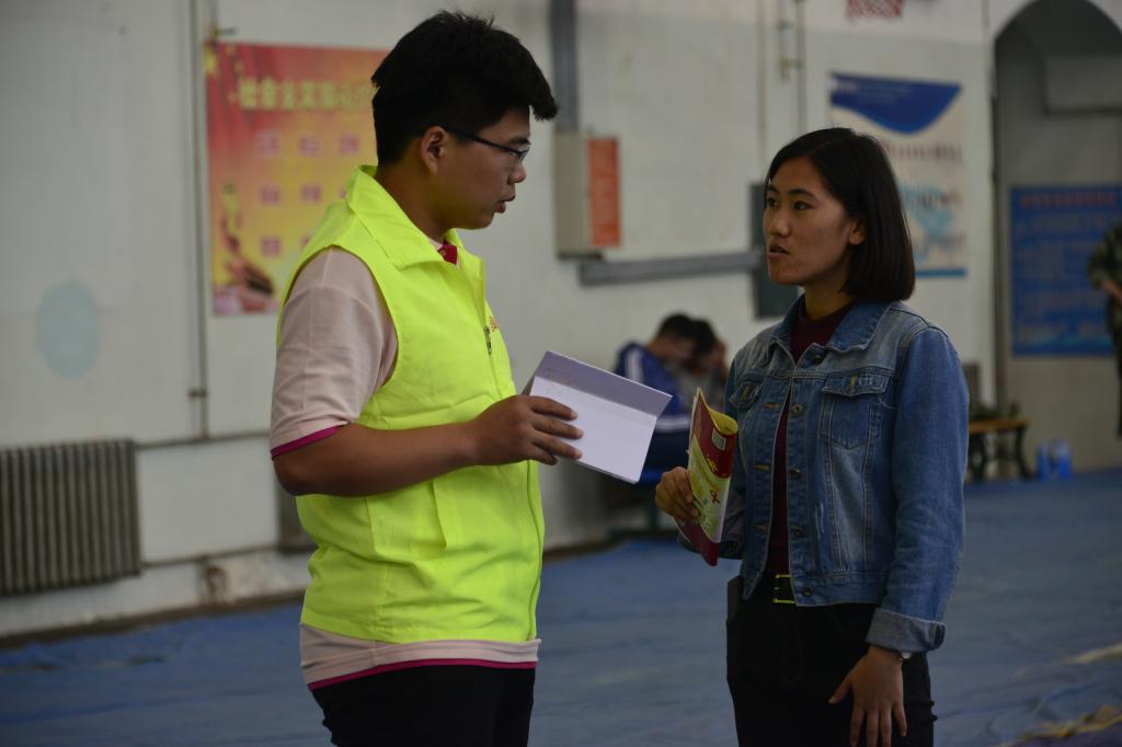 大学生志愿者与新生进行交流