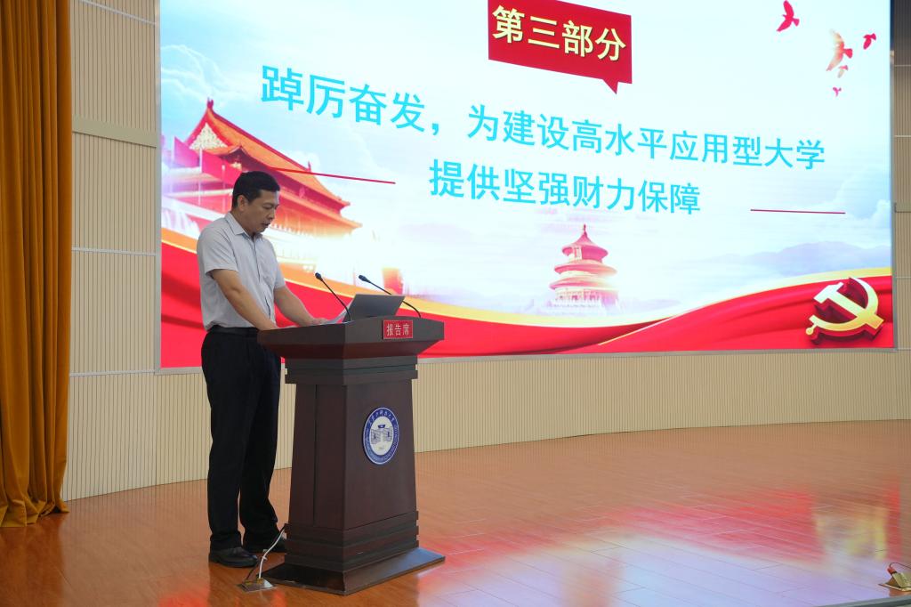 财务处处长高郁以《汲取新思想的精粹 务实担当 坚决扛起保障学校发展的财务责任》为题,阐释了学习领会运用党的创新理论,多措并举、综合施策,以高质量财务工作服务学校高质量发展等方面进行了工作交流。