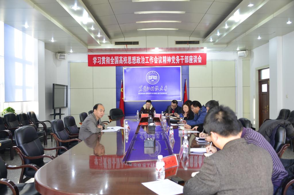 16日下午2点,乐鱼网站_乐鱼(中国)在办公楼6001会议室召开党务干部学习习近平总书记在全国高校思想政治工作会议上的讲话精神座谈会。会议由学校党委常委、组织部部长陈玉平主持。党委宣传部常务副部长何景洋、外国语学院党委书记唐立国、人文学院党委书记林艳、理学院党委书记王建国、电气学院党委书记王立云、国际教育学院党委书记邬承斌、计算机学院党委书记吕哲峰、党委宣传(统战)部副部长齐秀强、校办副主任张晓光分别交流学习体会。最后,陈部长围绕党务干部如何履职尽责、全面做好新形势下高校思想政治工作与大家分享了学习体会。