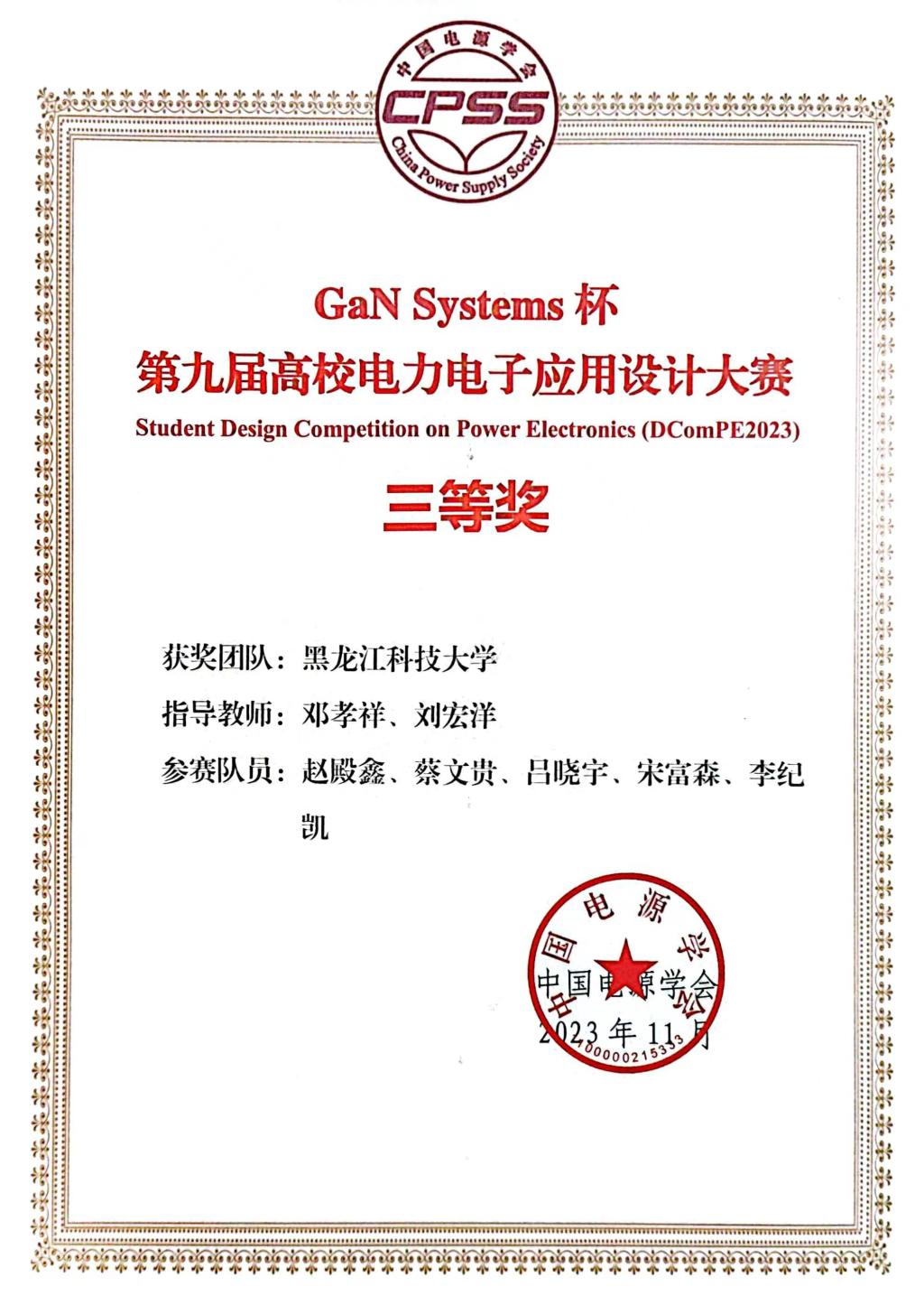 近日由中国电源学会主办,中国矿业大学承办的“GaN Systems”杯第九届高校电力电子应用设计大赛决赛在广州市成功举办,共吸引了华中科技大学、武汉大学、东南大学、华南理工大学、西南交通大学等68支参赛队伍积极报名参赛,最终包括乐鱼网站_乐鱼(中国)在内的24支参赛队伍在经过激烈的角逐后入围决赛。由电气学院邓孝祥教授和刘宏洋副教授指导的队伍“松花江上最靓的仔”(赵殿鑫、蔡文贵、吕晓宇、李纪凯、宋富森),成功杀入决赛,成为东北三省唯一一所晋级决赛的高校,最终与武汉大学、华南理工大学、东南大学并列三等奖。