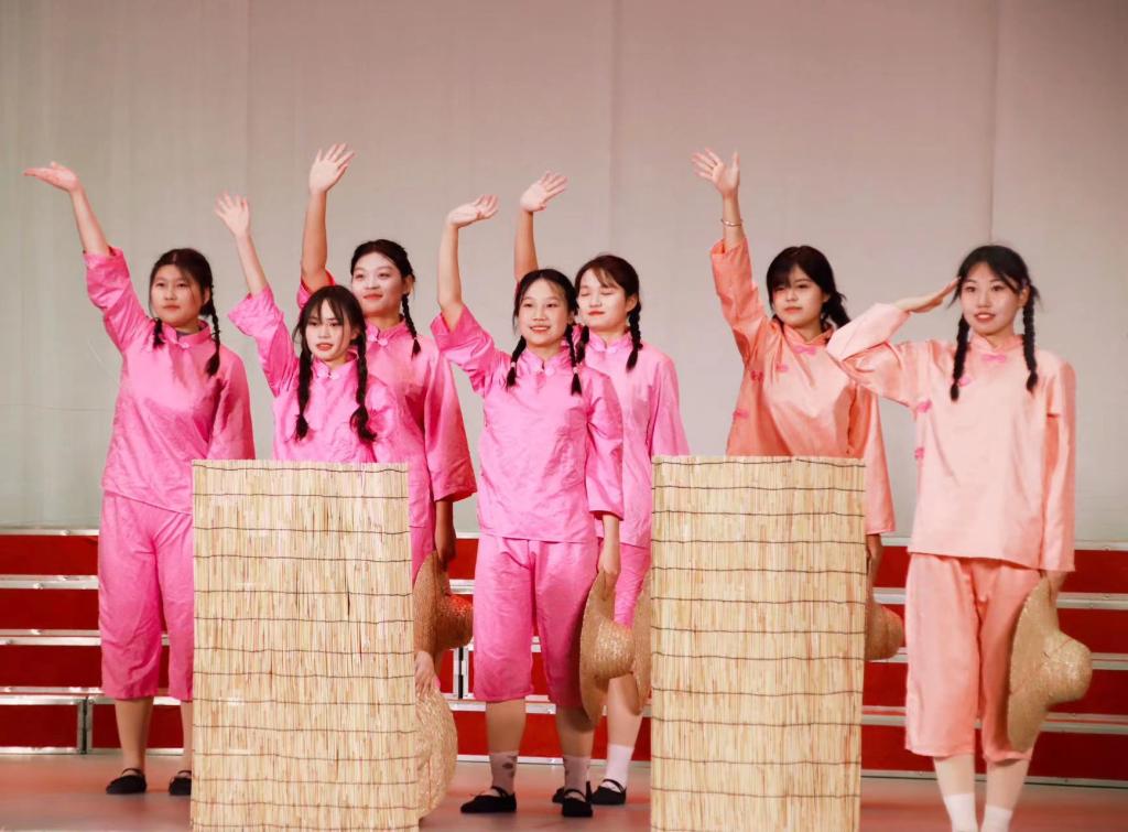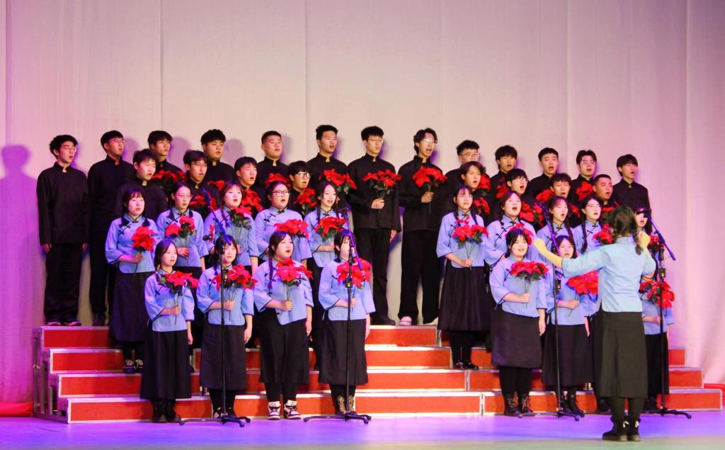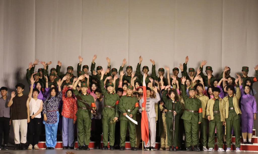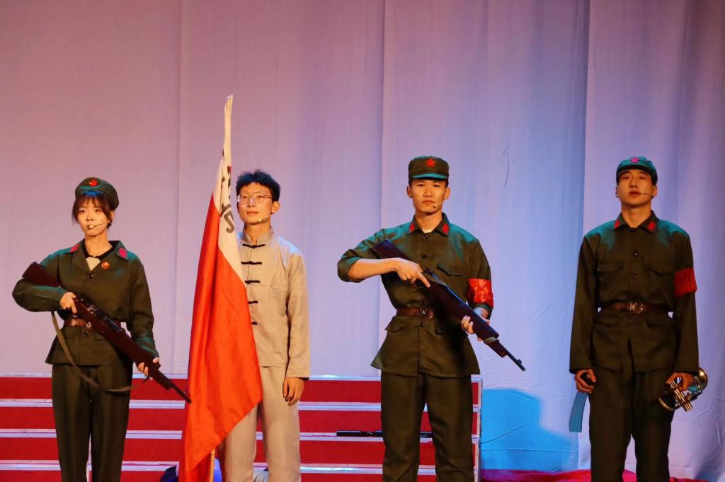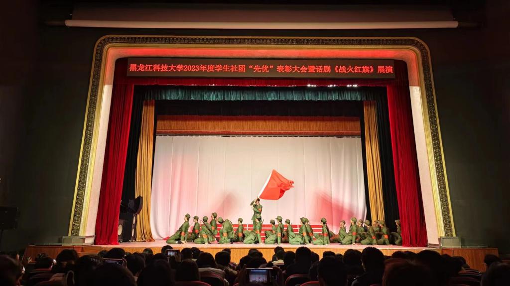 表彰大会结束后,大学生凤凰鸟艺术团、大学生合唱团、大学生仪仗队联合表演了原创红色话剧《战火红旗》。该剧由校团委社团工作部精心设计和编排,共分为9幕,演绎了在抗日战争时期,东北抗联战士不畏牺牲与日本侵略者英勇顽强斗争的故事。演员们真情投入的表演带领现场师生重回那个硝烟弥漫、血雨腥风的抗日战争年代,让观众们真切感受到“东北抗联精神”的深刻内涵和时代魅力,演出现场不时爆发出热烈的掌声。