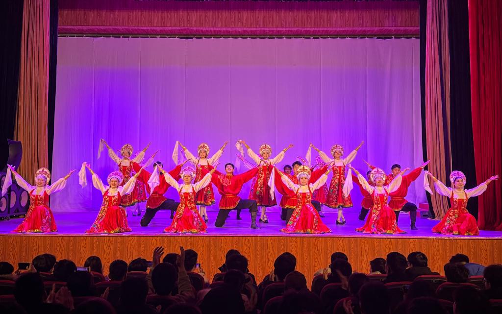 一曲气势磅礴的器乐合奏《战台风》拉开了演出的序幕;歌曲《有生之恋》《春风十万里》,温柔的歌声背后蕴藏着深厚的情感,优美雅正的旋律,如春风化雨般抚慰心灵;群口快板《绕口令》,幽默与智慧的碰撞让大家笑声不断;竹笛齐奏《扬鞭催马运粮忙》,乐曲热情明快,马蹄击节,车轮吟唱,快乐的农夫扬鞭催马,把丰收的喜悦铺撒在运粮的小道上;舞蹈《生的希望》,展现了人民群众、党和政府团结一心奋力抗灾的中国精神,书写了人民至上、生命至上的时代答卷,彰显了中华民族的力量与担当;唢呐齐奏《打枣》、器乐合奏《追风的云青马》、俄罗斯民间舞蹈《卡林卡》等精彩曲目逐一上演,节奏律动活泼,音声相和,踏乐而来。在观众的热烈掌声中,演出落下帷幕。