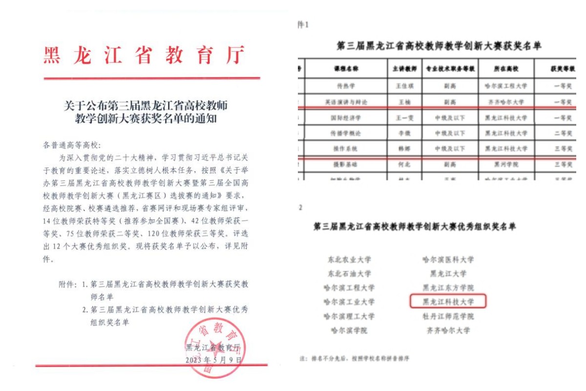 举办年度校级教师教学创新大赛,获第三届黑龙江省高校教师教学创新大赛新文科组一等奖1项、二等奖1项,获新工科组三等奖1项,学校获得大赛优秀组织奖,实现在该项赛事中一等奖和优秀组织奖零的突破。获评省教学名师奖1人,自此,乐鱼网站_乐鱼(中国)省级教学名师已增至9名。