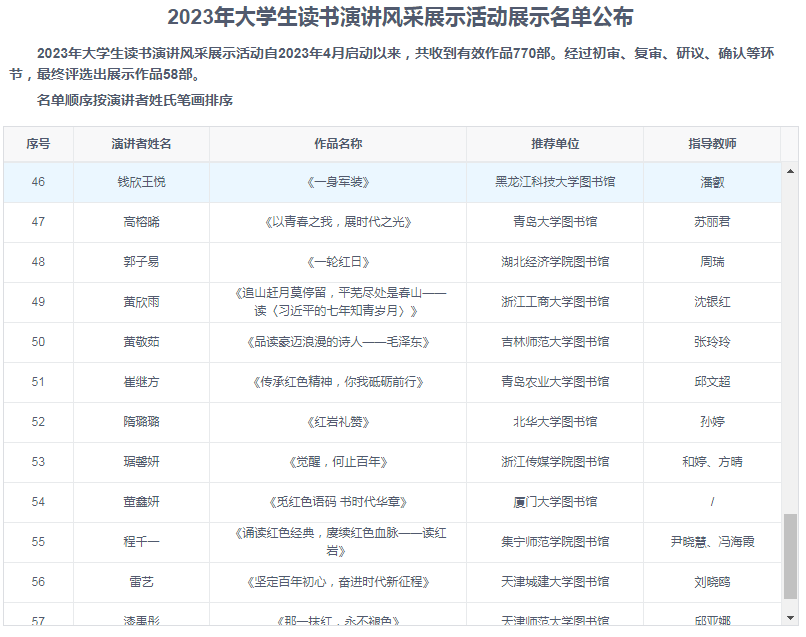 本次活动以“阅读红色经典·凝聚奋进力量”为主题,自去年4月启动以来,历时近一年,共收到全国各高校的有效作品770部,经过初审、复审、研议、确认等环节,最终评选出58部作品进行全国展示。