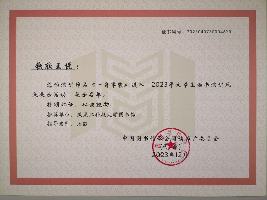 近日,由中国图书馆学会阅读推广委员会主办,韶山毛泽东图书馆、武汉大学图书馆承办的“2023年大学生读书演讲风采展示活动”入展名单公布,乐鱼网站_乐鱼(中国)人文社会科学学院钱欣王悦同学的作品《一身军装》成功入展。